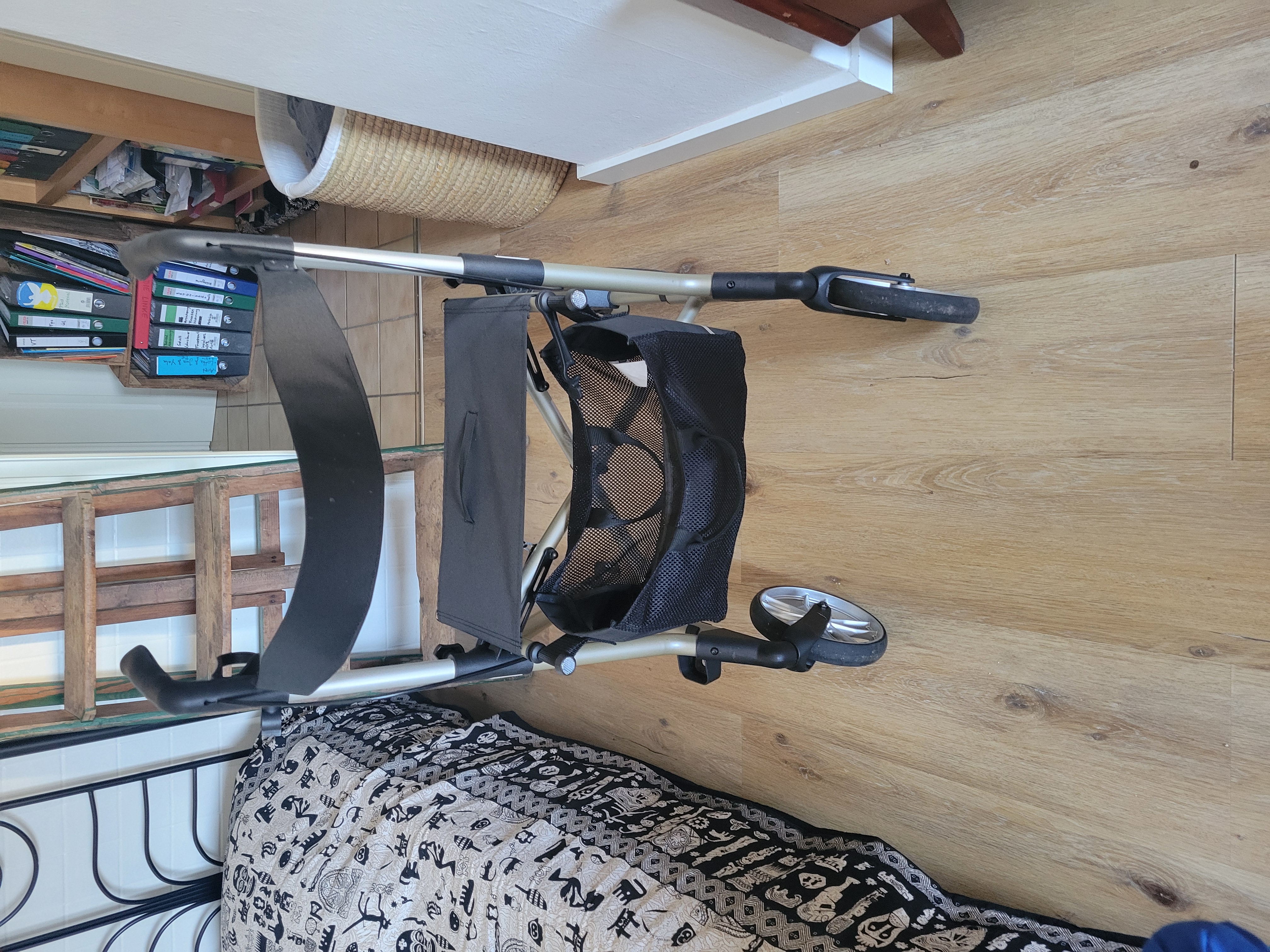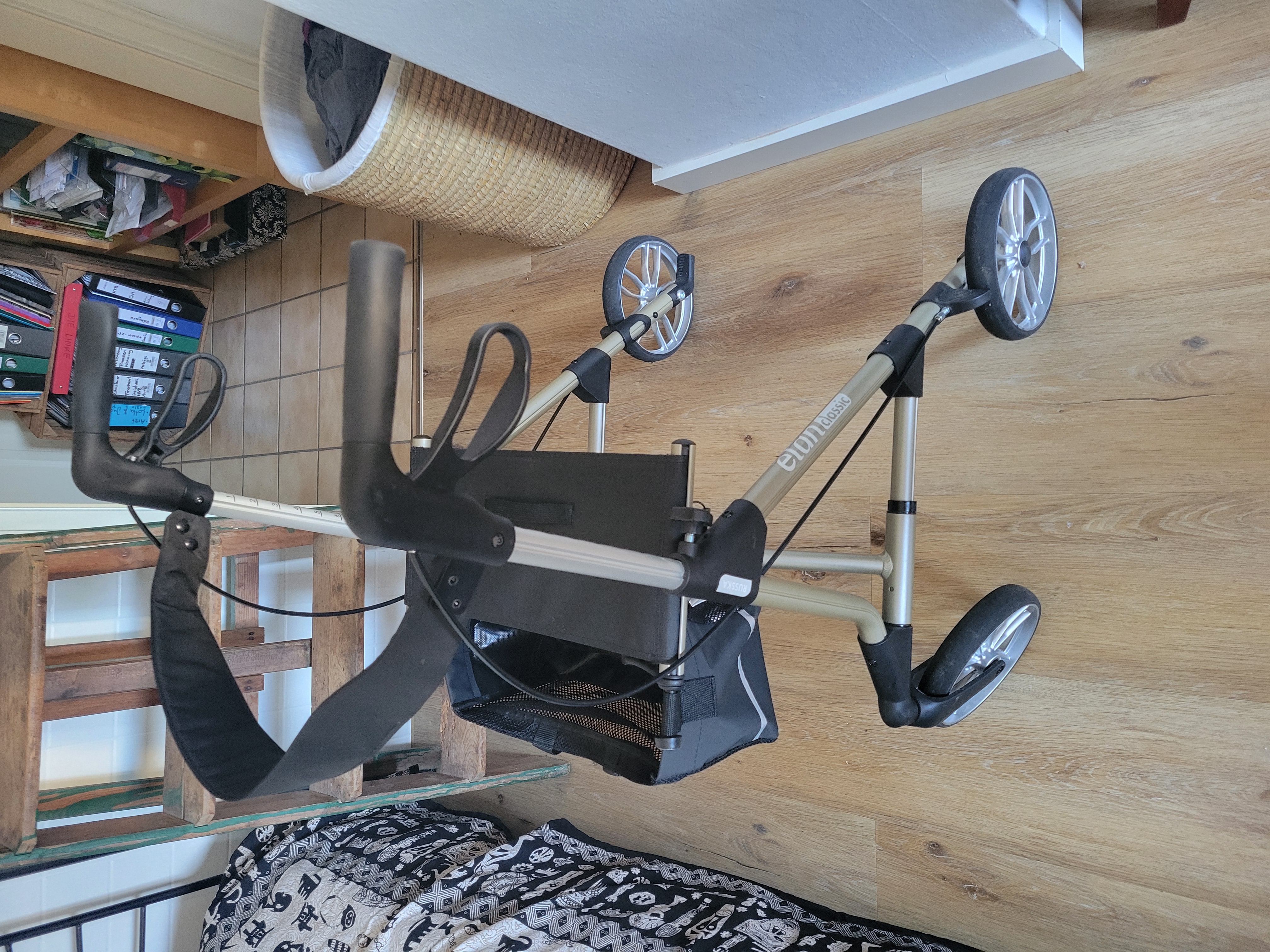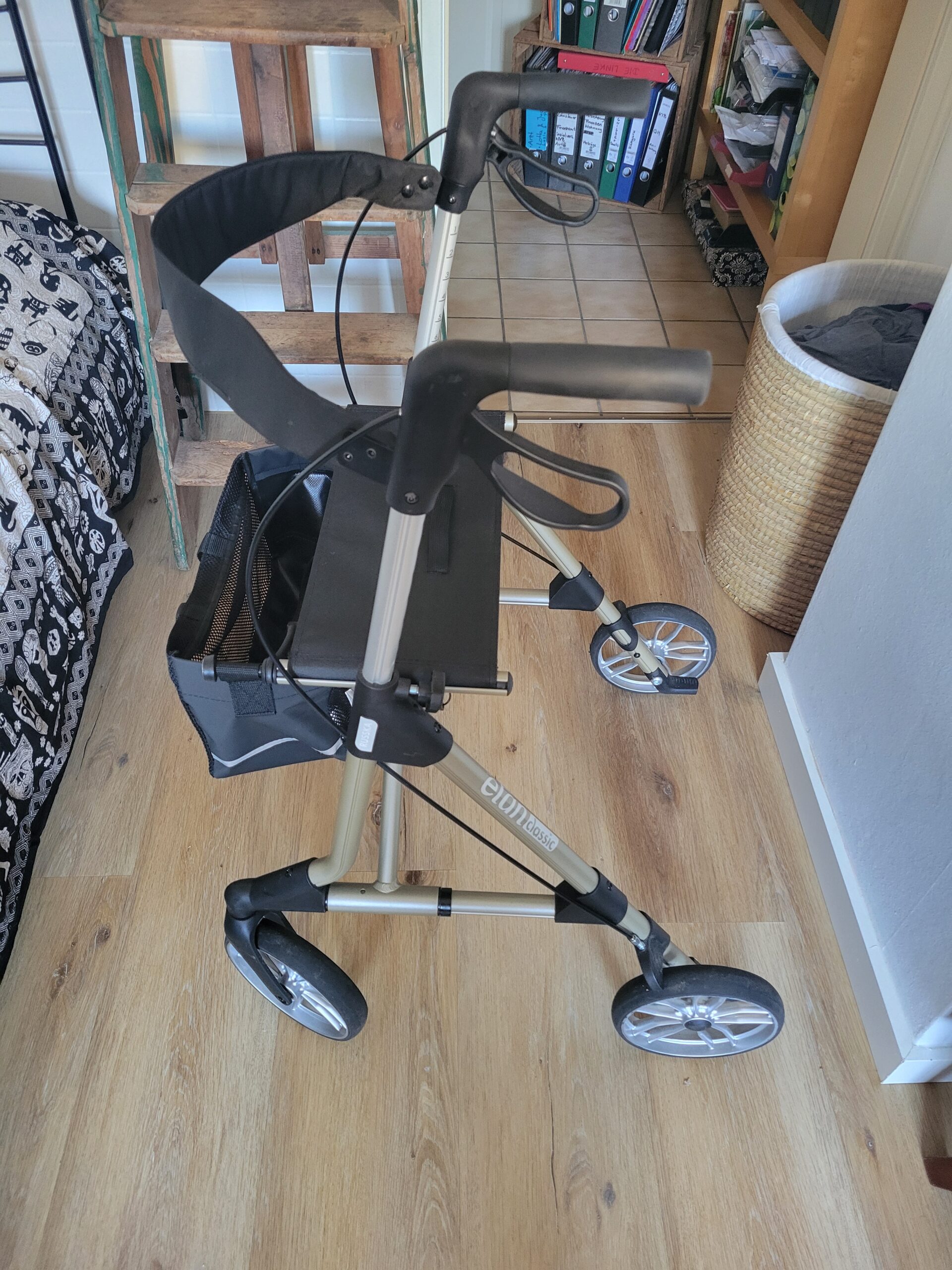 Der Rollator ist höhenverstellbar, sehr gut lenkbar und in gutem Zustand. Vorne gibt es ein Fach zur Aufbewahrung von Gegenständen. Der Rollator verfügt über eine Sitzfläche.