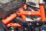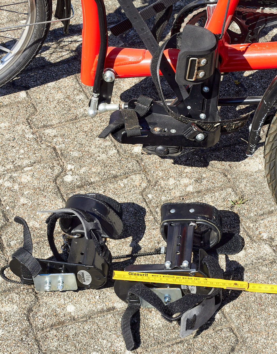 2 Paar Fußhalterungen mit Beinführungen mit Klettriemen und Klettverschluß, Rückenlehne, Korb hinten