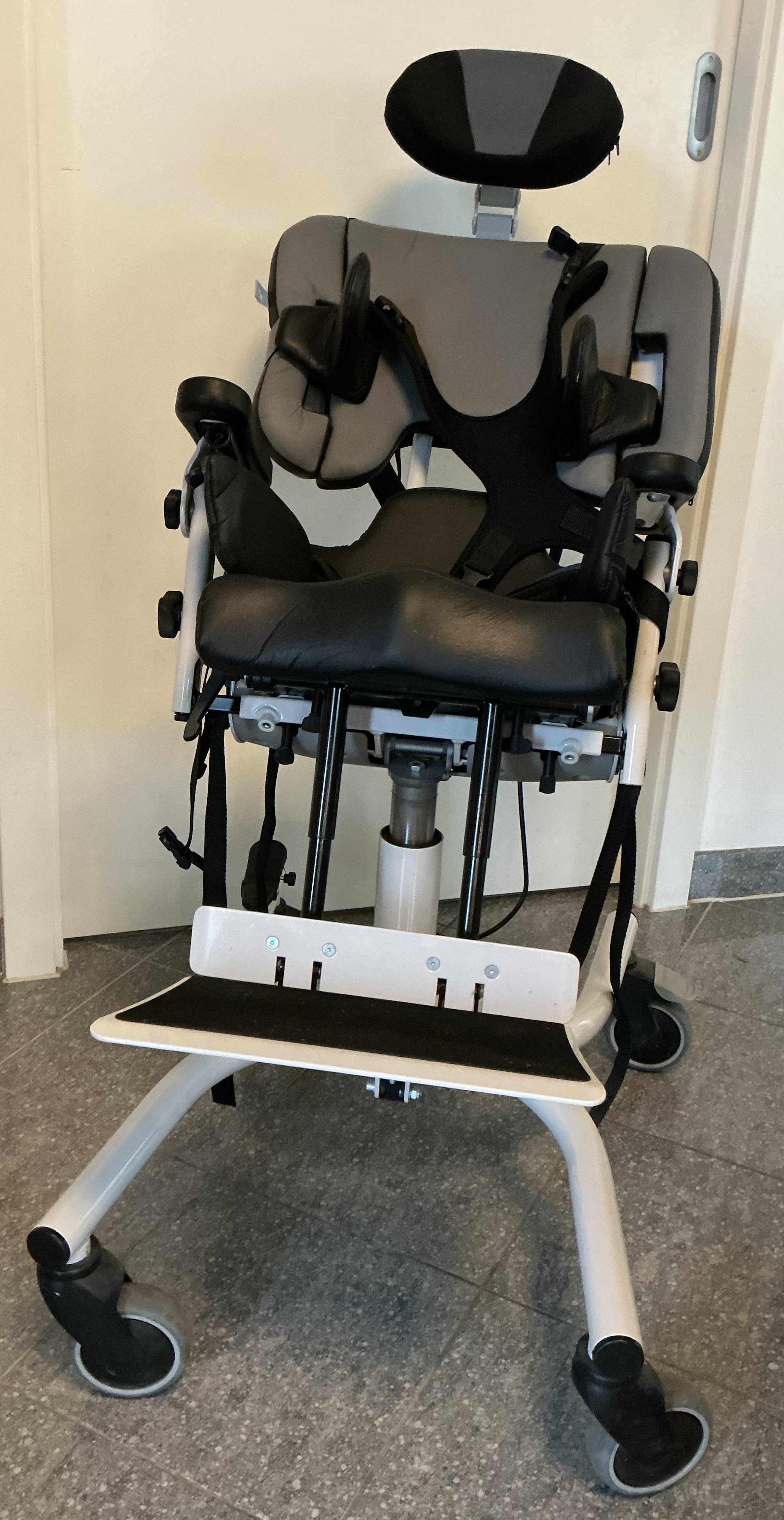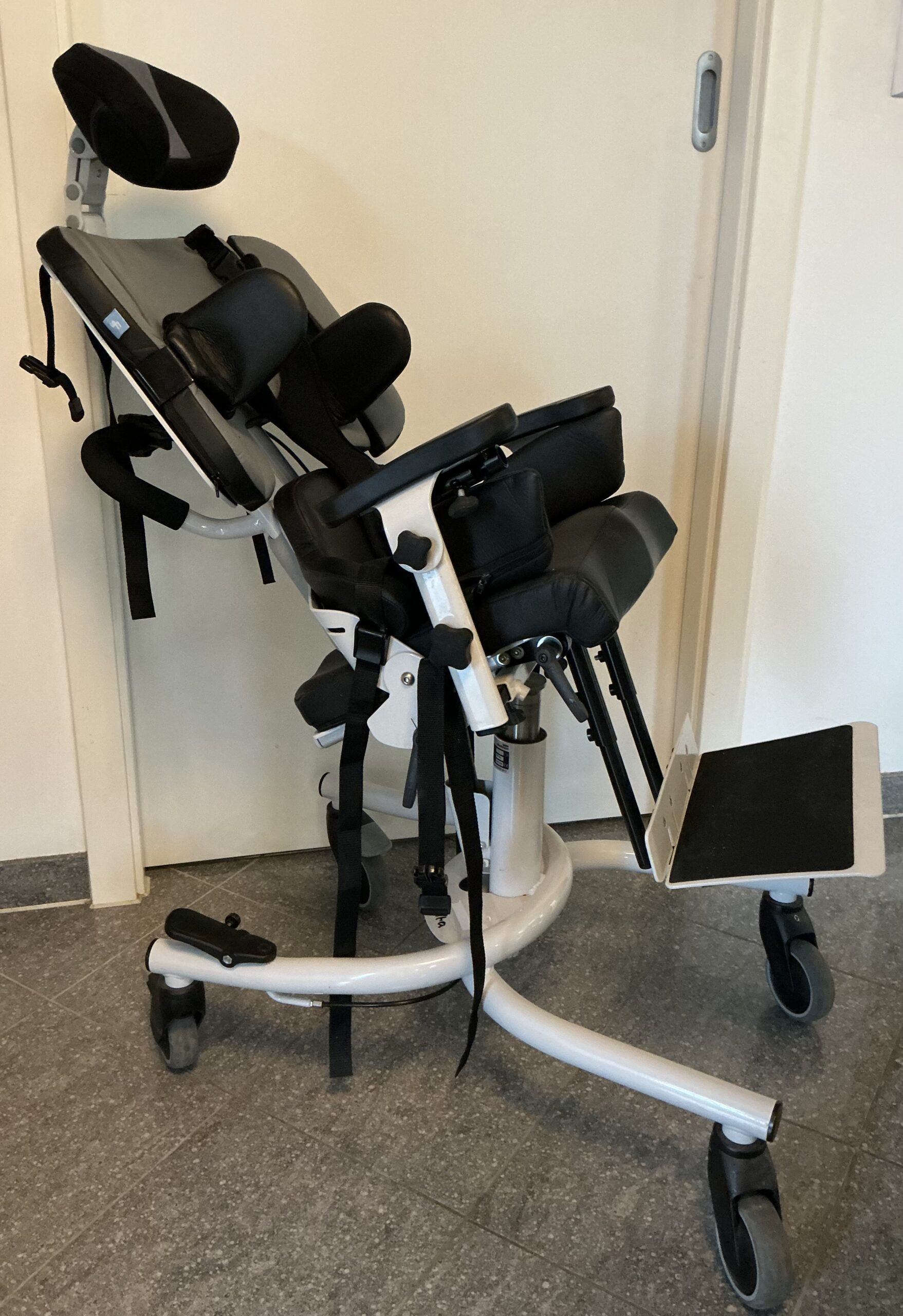 Inkl. Therapietisch, Hüft- und Brustgurt (wie auf den Bildern zu sehen). Ebenso ist eine Ersatzkopfstütze, sowie der „kurze Rücken“ in meinem Angebot enthalten. Ersatzbezüge inkl. Schaumstoff für den kurzen Rücken und Sitzfläche in Blau/Grau (letztes Bild).